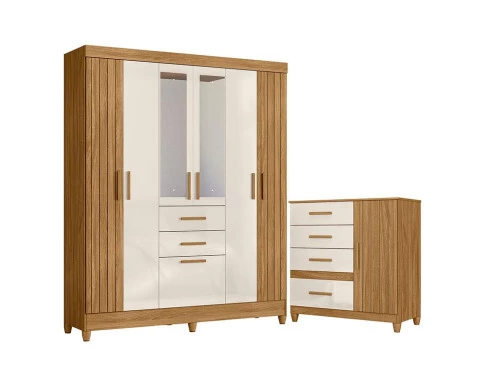 Guarda Roupa Solteiro Malta com Espelho e Cômoda Vênus com Pés Freijó Off White – Moval