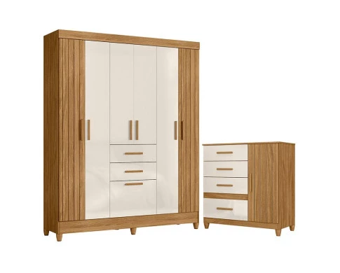 Guarda Roupa Solteiro Malta e Cômoda Vênus com Pés Freijó Off White – Moval