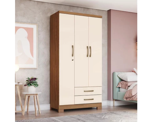 Guarda Roupa Solteiro Miami Ambiente 3 Portas 2 Gavetas com Chave Nature Off White - Henn