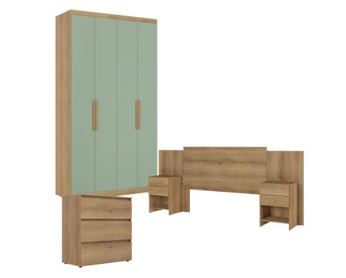 Guarda Roupa Solteiro Milan 4 Portas Capuccino Menta com Cômoda Gaveteiro Condessa e Cabeceira Formosa Capuccino- THB