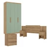 Conjunto completo para quarto de solteiro composto por Guarda-Roupa Milan 4 Portas, Cômoda Gaveteiro Condessa e Cabeceira Formosa na cor Capuccino/Menta. O guarda-roupa possui ótimo espaço interno com prateleiras, cabideiro e gavetas, garantindo organização prática. A cômoda oferece gavetas amplas, enquanto a cabeceira traz charme e acabamento moderno ao ambiente. Ideal para quem busca um quarto bonito, funcional e com móveis combinando.