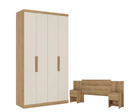 Guarda Roupa Solteiro Milan 4 Portas Capuccino Off White Acetinado e Cabeceira com Mesas de Cabeceira Formosa Capuccino - THB