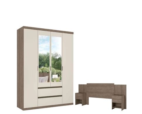 Guarda Roupa Solteiro Nobre Glass 4 Portas Rustic Off White Acetinado e Cabeceira com Mesas de Cabeceira Formosa Rustic - THB