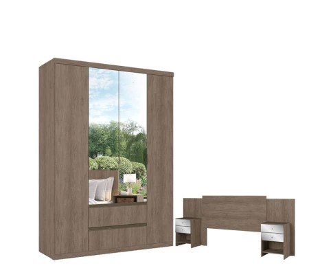 Guarda Roupa Solteiro Nobre Slim Glass 4 Portas Rustic Acetinado e Cabeceira com Mesas de Cabeceira Formosa Glass Rustic - THB