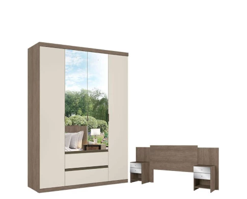 Guarda Roupa Solteiro Nobre Slim Glass 4 Portas Rustic Off White Acetinado e Cabeceira com Mesas de Cabeceira Formosa Glass Rustic - THB