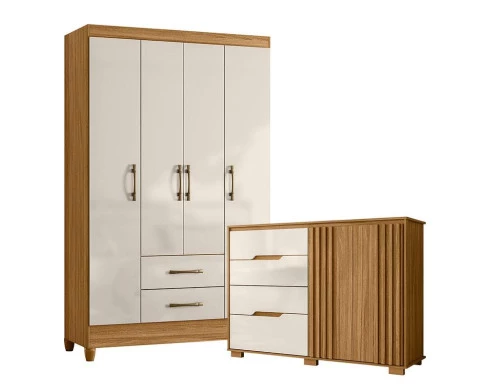 Organize seu quarto com elegância e o melhor custo benefício do mercado. Apresentamos o Guarda Roupa Solteiro Paraty e Cômoda Texas fabricados pela Moval. Guarda Roupa com 04 portas e 02 gavetas com corrediças metálicas, puxadores na cor bronze, cabideiro para melhor organização interna, espaço ideal para roupas longas e pés em PVC. A cômoda possui 04 gavetas com corrediças telescópicas, porta com detalhes ripados, puxadores usinados, pés em PVC, dobradiças 35 mm com amortecedor e um design moderno que combina com qualquer decoração. Fabricado com materiais de alta qualidade que garante resistência e durabilidade ao produto. Confira mais detalhes e aproveite!