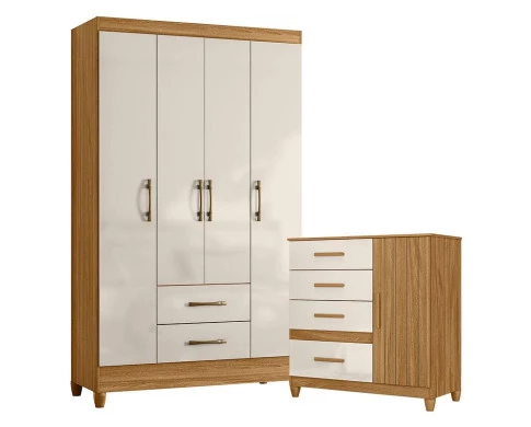 Organize seu quarto com elegância e o melhor custo benefício do mercado. Apresentamos o Guarda Roupa Solteiro Paraty e Cômoda Vênus fabricados pela Moval. Guarda Roupa com 04 portas e 02 gavetas com corrediças metálicas, puxadores na cor bronze, cabideiro para melhor organização interna, espaço ideal para roupas longas e pés em PVC. A cômoda possui 04 gavetas com corrediças metálicas, 01 porta, puxadores em MDF, pés em PVC e um design moderno que combina com qualquer decoração. Fabricado com materiais de alta qualidade que garante resistência e durabilidade ao produto. Confira mais detalhes e aproveite!