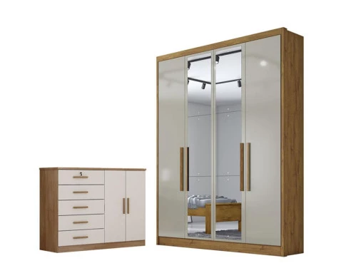 Procurando móveis para seu quarto? Aqui você encontra a combinação ideal para que seu quarto fique mais bonito e elegante! Apresentamos para você este belo conjunto composto pelo guarda roupa da linha Sevilhae a cômoda Seul. O guarda roupa com design moderno possui amplo espaço interno, varias repartições, prateleiras, gavetas. A cômoda conta com 4 gavetas equipadas com corrediças telescópicas e uma porta ganhando um espaço extra. Não perca mais tempo venha aproveitar e garantir já o seu!