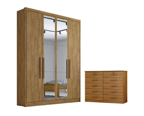 Guarda Roupa Solteiro Sevilha 4 Portas 3 Gavetas Cumaru 23 com Espelho – Novo Horizonte