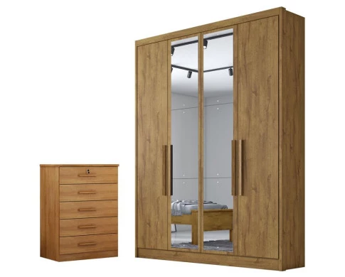 Guarda Roupa Solteiro Sevilha 4 Portas 3 Gavetas Cumaru 23 com Espelho – Novo Horizonte