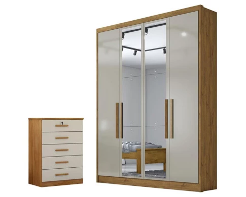 Guarda Roupa Solteiro Sevilha 4 Portas 3 Gavetas Cumaru 25 Fendi com Espelho – Novo Horizonte