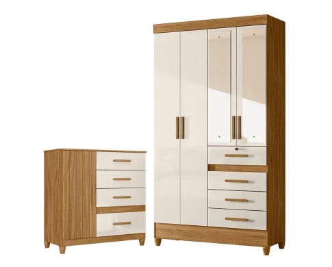 Guarda Roupa Solteiro Sobral com Espelho e Cômoda Vênus com pés Freijó Off White – Moval