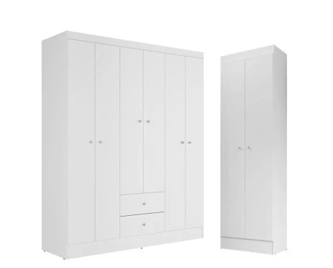 Com design moderno, esse conjunto traz um toque natural e sofisticado ao ambiente, unindo funcionalidade e beleza em cada detalhe.O Guarda-Roupa Versa Casal possui seis portas amplas, prateleiras espaçosas, cabideiro metálico e gavetas com corrediças telescópicas, oferecendo excelente organização. O Armário Multiuso Aura é o complemento ideal para aumentar o armazenamento do ambiente. Desenvolvidos pela Kits Paraná com toda simplicidade.