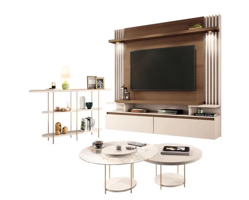 Home Suspenso Cosmo Castanho Off White e Aparador Infinity e Kit Mesa de Centro Sky Off White- HB Móveis