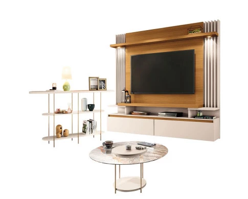 Home Suspenso Cosmo Cinamomo Off White e Aparador Infinity e Mesa de Centro Sky com Tampo de Vidro Off White- HB Móveis