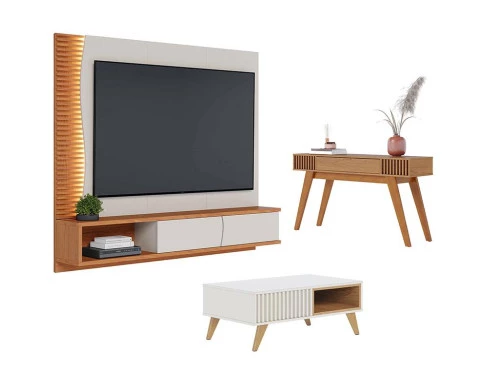 Está procurando móveis para montar sua sala? Apresentamos para você este belo conjunto composto pelo Home Suspenso com Mesa de Centro Jeri e Aparador Riviera, fabricados pela DJ Móveis. O home possui detalhe ripado artesanal, com peça ondulada e luz de led em uma das laterais, que agregam modernidade e estilo. A mesa possui dois nichos internos e pés em madeira maciça dando estabilidade e um toque sofisticado. O aparador possui 01 gaveta central com corrediças telescópicas, puxador metálico dourado fosco, ripado artesanal nas laterais, peças traseiras com acabamento possibilitando a utilização do móvel para divisão de ambientes e pés em madeira maciça. Combinando praticidade, design e sofisticação, é perfeito para quem está buscando qualidade e sustentabilidade para elevar o estilo do seu ambiente. Confira e aproveite!