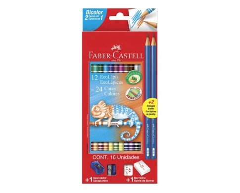 Chegou a hora de deixar seus desenhos cheio de cor e estilo! O Lápis de Cor Ecolápis 120612+2N 12 Bicolor desenvolvido pela Faber Castell é o kit perfeito para proporcionar praticidade e qualidade no seu dia a dia escolar, pois possui 12 lápis bicolor, 2 lápis grafite, 1 apontador e uma borracha, não perca mais tempo e aproveite!