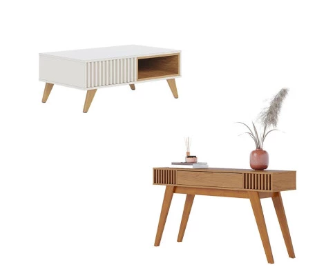 Apresentamos este conjunto de Mesa de Centro Jeri e Aparador Riviera, fabricados pela Colibri. A mesa possui design contemporâneo e simétrico permitindo que possa ser usada ambos os lados, dois nichos internos e pés em madeira maciça dando estabilidade e um toque sofisticado. O aparador possui 01 gaveta central com corrediças telescópicas, puxador metálico dourado fosco, ripado artesanal nas laterais, peças traseiras com acabamento possibilitando a utilização do móvel para divisão de ambientes e pés em madeira maciça. Una praticidade, funcionalidade e estilo para seu ambiente! Garanta já o seu!