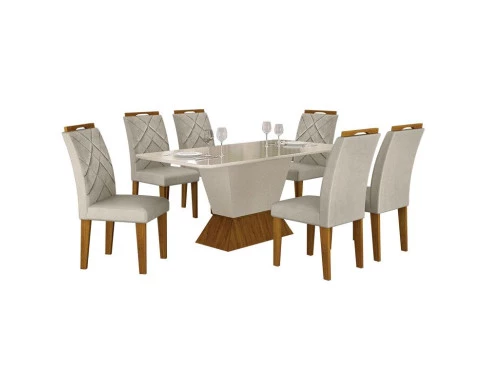 Deixe sua sala de jantar ainda mais aconchegante com moveis de qualidade e o melhor preço do mercado. Apresentamos a sala de jantar com mesa e cadeiras da linha Larissa, desenvolvidas pela Leifer Móveis. Mesa com base em MDF, tampo com vidro serigrafado e canto copo. As cadeiras Larissa New são fabricadas em MDF, possui encosto bordado e tecido de alta qualidade. Decore o seu ambiente com elegância e desfrute de momentos alegres e confortáveis com amigos e familiares!