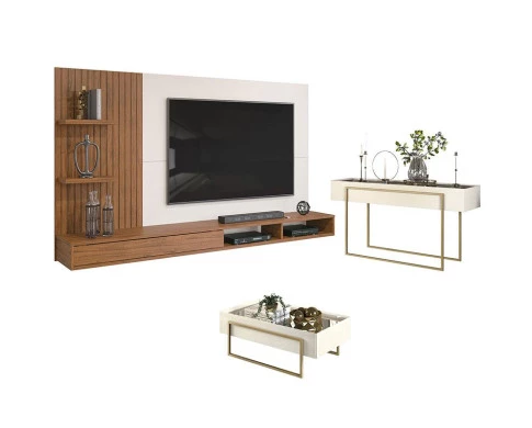 Painel para Tv Bento Freijó Off White com Aparador para Sala Petri e Mesa de Centro Petri Off White – DJ Móveis