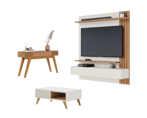 Painel para Tv Home Suspenso Juriti 1.5 com Mesa de Centro Jeri Off White Matte Freijó e Aparador Riviera Freijó - Colibri