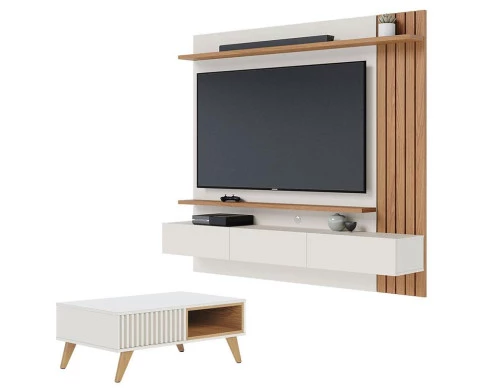 Painel para Tv Home Suspenso Juriti 1.8 Off White Matte Freijó com Mesa de Centro Jeri Off White Freijó - Colibri