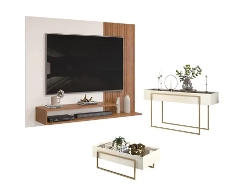 Painel para Tv Nando Freijó Off White com Aparador Pilar e Mesa de Centro Pilar Off White – DJ Móveis