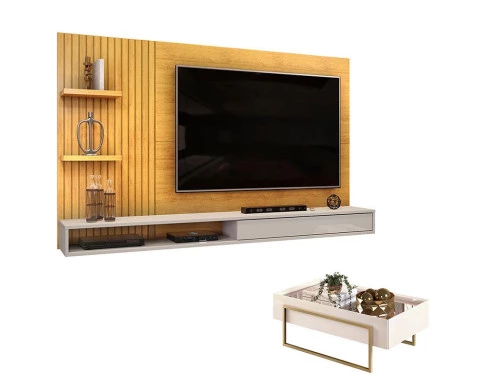 Está procurando móveis para montar sua sala? Apresentamos para você este belo conjunto composto pelo Painel para TV Suspenso e a Mesa de Centro da linha Pilar, fabricados pela DJ Móveis. O painel possui uma porta deslizante, dois nichos e duas prateleiras laterais para acomodar seus aparelhos eletrônicos e objetos decorativos, além do detalhe frisado, acrescentando um toque de elegância ao ambiente. A mesa de centro possui tampo com espelho aplicado entrega refinamento e um toque contemporâneo, enquanto suas laterais são chanfradas, oferecendo um acabamento delicado e diferenciado e pés em metal na cor dourado mostra um toque de luxo e estabilidade. Combinando praticidade, design e sofisticação, é perfeito para quem está buscando qualidade e sustentabilidade para elevar o estilo do seu ambiente. Confira e aproveite!