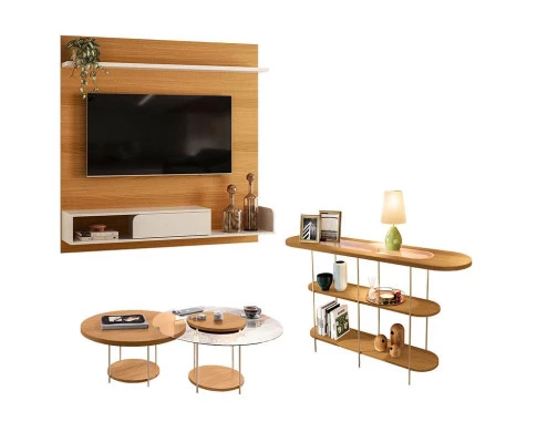 Painel para TV Suspenso Evo com Kit Mesa de Centro Sky e Aparador Infinity Cinamomo Off White – HB Móveis