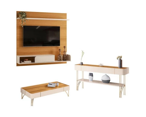 Painel para TV Suspenso Evo com Mesa de Centro Cadenza e Aparador Vivant Cinamomo Off White – HB Móveis
