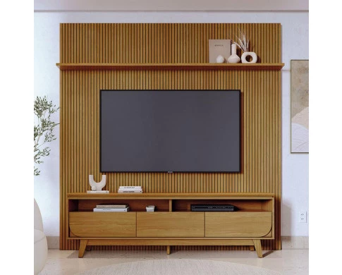 Painel Piso Teto New Guaporé com Rack Bancada Selene New Luna Ambiente Cumaru - Madetec