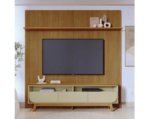 Painel Piso Teto New Guaporé com Rack Bancada Selene New Luna Ambiente Cumaru Opala - Madetec