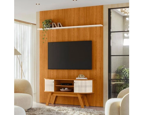 Apresentamos estes Painel Piso Teto New Interlagos com Rack Bancada Atlanta New Silverstone na cor Cinamomo Off White painel desenvolvido em MDF frisado com baixo relevo com portas flexíveis em MDF com tampo e base com detalhes curvos,Bancada desenvolvida com portas flexíveis em MDF com tampo e base com detalhes curvos, puxadores em poliestireno, com pés retrô e estrutura em MDP de 15 e 25mm. Desenvolvidos pela Madetec com toda qualidade e modernidade adquire o seu.