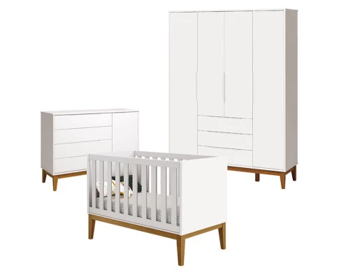 Começou a montar o quartinho do bebê? Então apresentamos para a mamãe esse conjunto exclusivo, combinando o estilo clássico do berço da linha New Classic com a moderna e prática linha Elfe da cômoda e guarda roupa. O berço foi projetado para acompanhar o crescimento do seu filho com base e pés em madeira maciça e grade fixa para maior segurança. Possui a opção de mini cama, além da regulagem da altura do estrado em três níveis. A cômoda conta com uma porta e quatro gavetas, já o guarda roupa possui quatro portas, três gavetas e cabideiro metálico. Tanto a cômoda quanto o guarda roupa, possuem corrediças telescópicas nas gavetas, puxadores embutidos, sistema anti-tombamento e pés em madeira. Fabricados pela Reller são desenvolvidos em MDF de alta qualidade, sendo perfeito para criar um ambiente acolhedor e duradouro para seu bebê. Confira e aproveite!