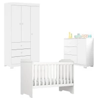 A mamãe começou a procurar móveis para o quartinho do seu bebê? Então apresentamos para você este belo conjunto composto pelo berço americano da linha Mel desenvolvido pela Carolina, cômoda e guarda roupa 3 portas da linha Duda desenvolvido pela Phoenix Baby. O berço pode ser utilizado futuramente como mini cama, prolongando a sua vida útil. A cômoda possui três gavetas e uma porta. Já o guarda roupa conta com três portas e três gavetas, oferecendo um amplo espaço interno para a mamãe poder acomodar as roupinhas e acessórios do seu filho. São fabricados em MDP/ MDF da mais alta qualidade, garantindo mais durabilidade e resistência. Esse conjunto irá combinar com qualquer ambiente, além de ser projetado para acompanhar todas as fases de crescimento do seu filho. Confira as características: