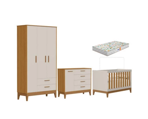 Quarto de Bebê Flip com Cômoda Sapateira Areia Acetinado Savana com Colchão Gazin - Reller
