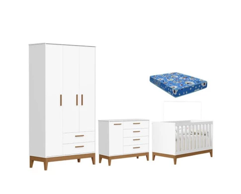 O Quarto de Bebê Flip da Reller é a escolha ideal para quem busca praticidade, beleza e conforto em um só conjunto. Com design moderno o kit com Roupeiro moderno é composto por um berço seguro e funcional, desenvolvido dentro das normas de qualidade, que garante noites tranquilas e acolhedoras. A Cômoda Sapateira oferece amplo espaço interno, equipada com corrediças telescópicas que proporcionam abertura suave, além de puxadores em MDF revestido e pés em madeira Para completar, o conjunto acompanha o Colchão , desenvolvido para oferecer o suporte ideal ao bebê, com estrutura firme e confortável. Desenvolvido pela Reller com toda praticidade.