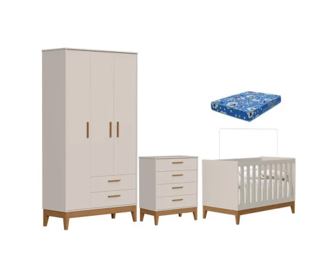 Quarto de Bebê Flip com Cômoda Gaveteiro Areia Acetinado com Colchão Ortobom - Reller