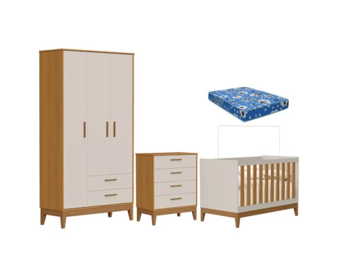 Quarto de Bebê Flip com Cômoda Gaveteiro Areia Acetinado Savana com Colchão Ortobom - Reller