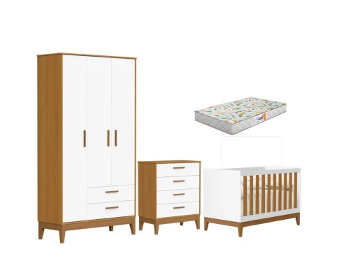 O Quarto de Bebê Flip da Reller é a escolha ideal para quem busca praticidade, beleza e conforto em um só conjunto. Com design moderno o kit com Roupeiro moderno é composto por um berço seguro e funcional, desenvolvido dentro das normas de qualidade, que garante noites tranquilas e acolhedoras. A cômoda gaveteiro oferece amplo espaço interno, equipada com corrediças telescópicas que proporcionam abertura suave, além de puxadores em MDF revestido e pés em madeira Para completar, o conjunto acompanha o Colchão Gazin, desenvolvido para oferecer o suporte ideal ao bebê, com estrutura firme e confortável. Desenvolvido pela Reller com toda praticidade.