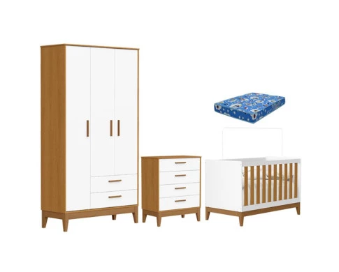 Quarto de Bebê Flip com Cômoda Gaveteiro Branco Acetinado Savana com Colchão Ortobom - Reller