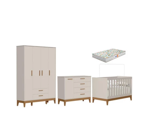 Quarto de Bebê Flip Guarda Roupa 4P Areia Acetinado com Colchão Gazin - Reller