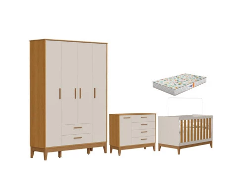 Quarto de Bebê Flip Guarda Roupa 4P Areia Acetinado Savana com Colchão Gazin - Reller