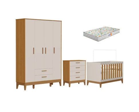Quarto de Bebê Flip Guarda Roupa 4P Areia Acetinado Savana com Colchão Gazin - Reller