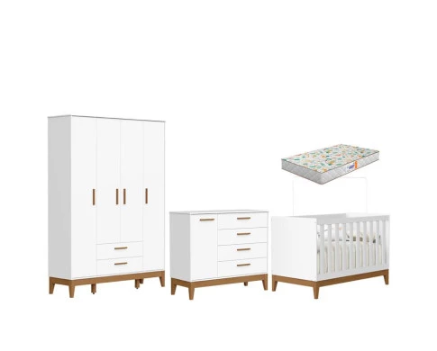 Quarto de Bebê Flip Guarda Roupa 4P Branco Acetinado com Colchão Gazin - Reller