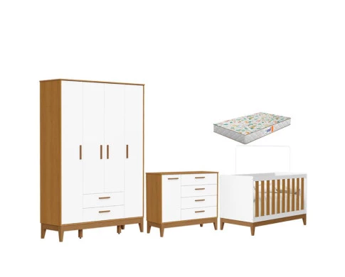 Quarto de Bebê Flip Guarda Roupa 4P Branco Acetinado Savana com Colchão Gazin - Reller