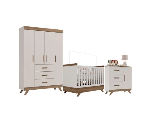 Quarto de Bebê Retrô Maya com Berço Americano Vitória Off White Carvalho – Carolina