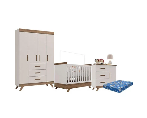Quarto de Bebê Retrô Maya com Berço Americano Vitória Off White Carvalho com Colchão Ortobom – Carolina
