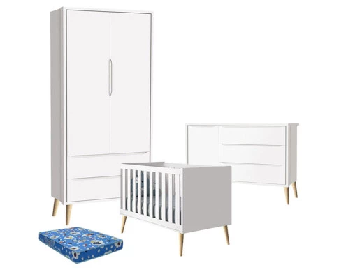 Quarto de Bebê Theo 2 Portas com Colchão Branco Acetinado Pés Madeira Natural - Reller