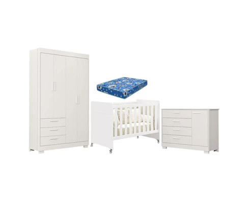 Quarto de Bebê Zaki e Berço Americano Evolution 4 em 1 Branco Acetinado com Colchão Ortobom - Reller
